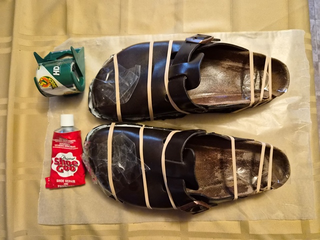 - Apply Shoe Goo and replace rubber bands (I used clear packing tape